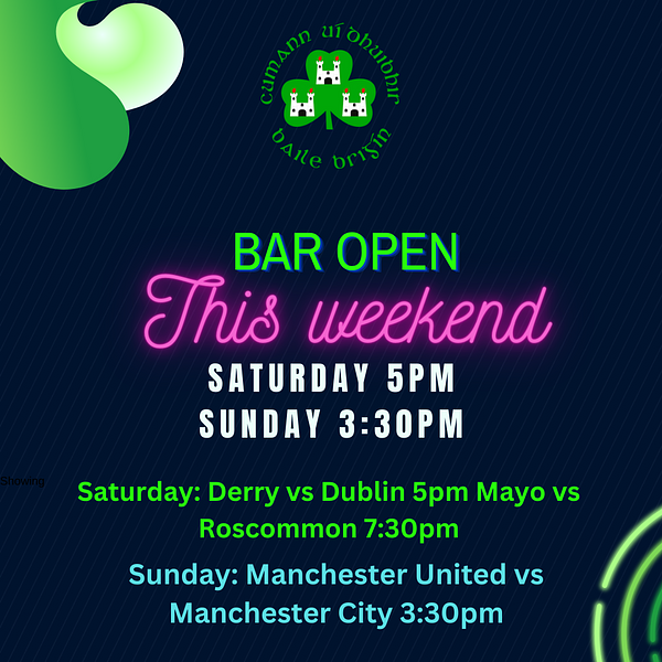 Bar open this weekend!💚 both Saturday and Sunday ; live GAA on Saturday and some Premier League action on the TV on Sunday🙌🏼