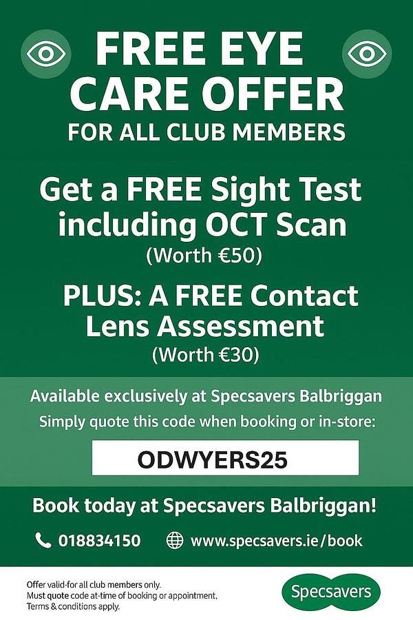 Specsavers Balbriggan have kindly teamed up with us to offer all members a FREE sight test worth €50 and a FREE contact lens assessment worth €30. This is exclusive to the Balbriggan store.