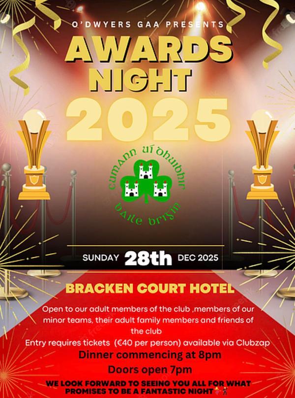 We hope to see you there💚💚 tickets to the adult and minor awards evening can be purchased via this link https://odwyersgaa.clubzap.com/products/32340/purchases/new