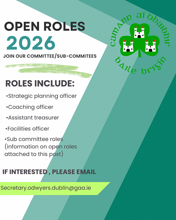 If you believe you would have the capacity to support any of the officer roles above or indeed would like to support one of these roles. Please reach out to Dave ( Chairperson.odwyers.dublin@gaa.ie ) or Paul ( secretary.odwyers.dublin@gaa.ie ) to discuss the role options