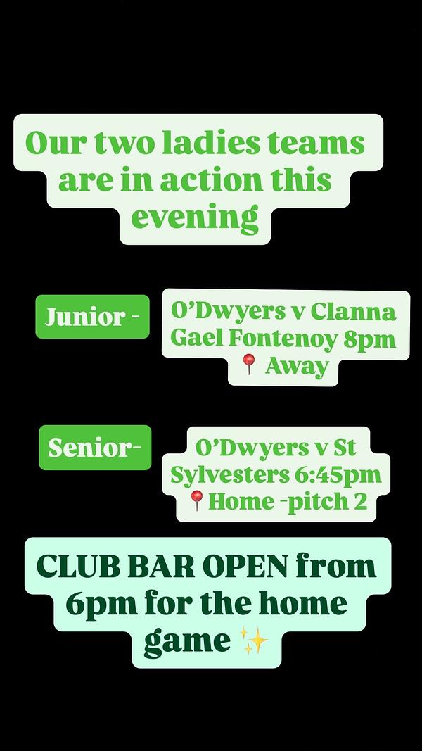 -Junior ladies v Clanna Gael Fontenoy 8pm - away