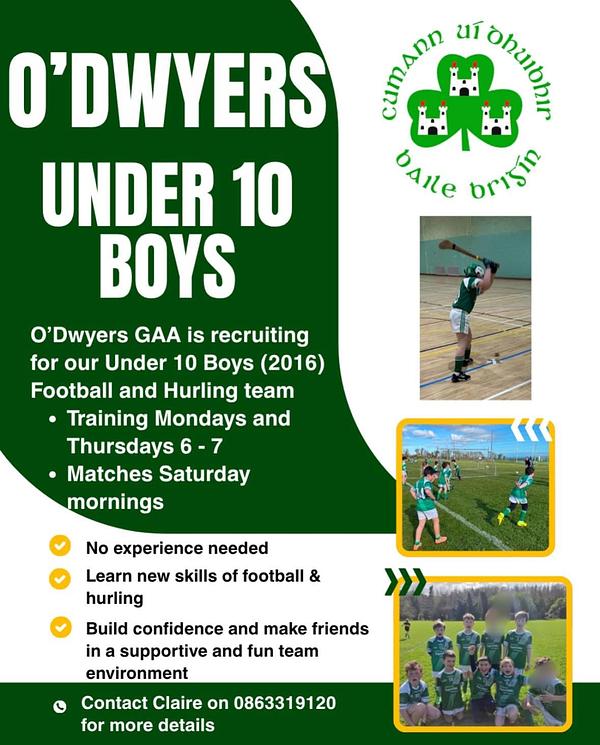 O’Dwyers GAA Under 10 Boys Football & Hurling team (born 2016) would love to see some new faces and expand the squad! A brilliant start to this year so far🔥Everyone is welcome—no experience needed 🙌